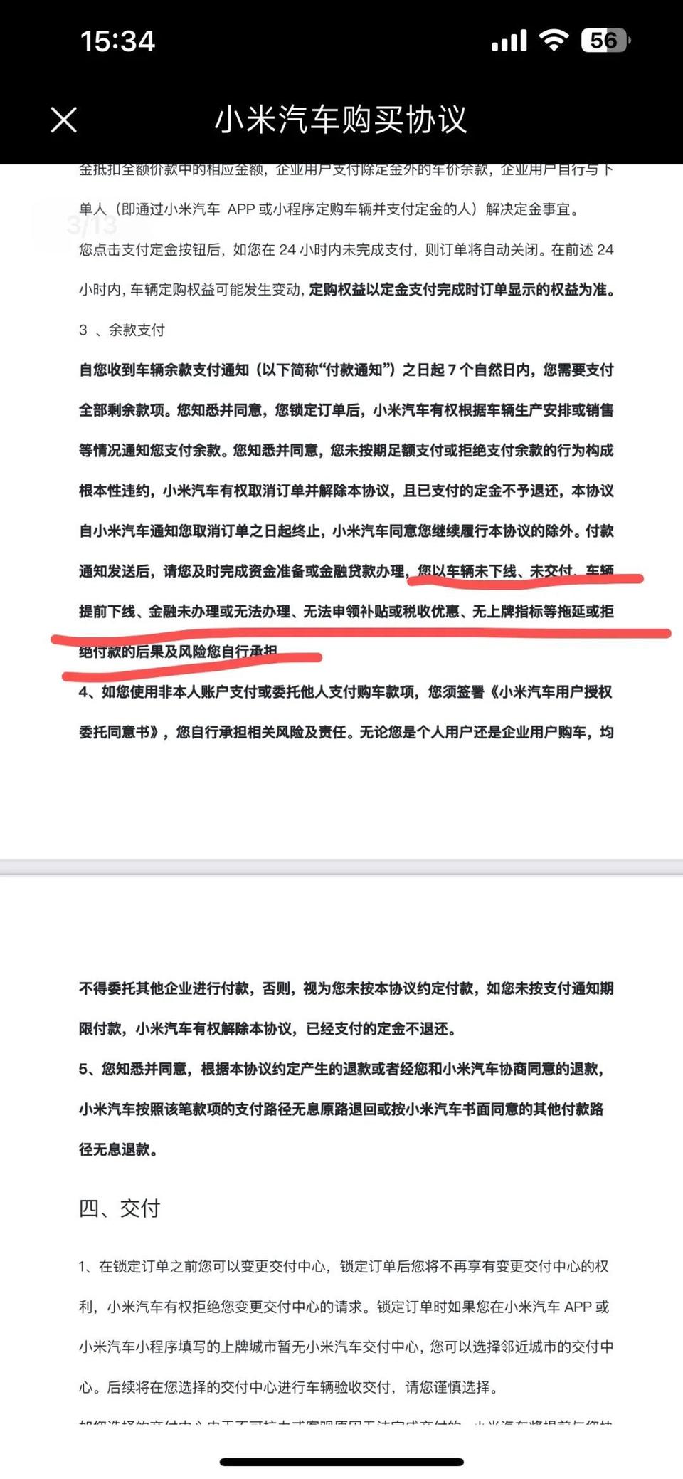小米汽车的购车协议揭示了引发争议的源头。合同中明确规定:小米有权基于 “车辆生产安排或销售情况”随时要求支付尾款。