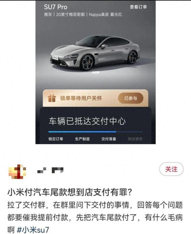 这与小米早期宣传形成鲜明对比。在《小米SU7答网友问》中,官方曾明确表示尾款可分多笔支付,且支持“在交车时支付”。这种合同条款与实际承诺的差异,让消费者感到被误导。