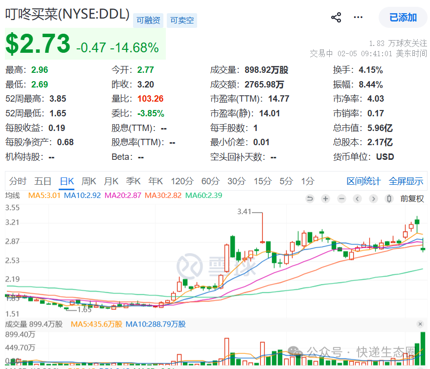 2月5日,美股盘前,叮咚买菜市值为6.94亿美元。