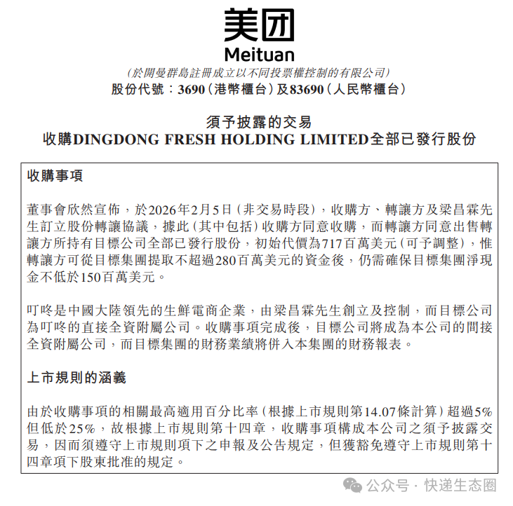 2月5日下午消息,美团于香港联交所发布公告,将以约7.17亿美元的初始对价,完成对叮咚买菜中国业务100%股权的收购。