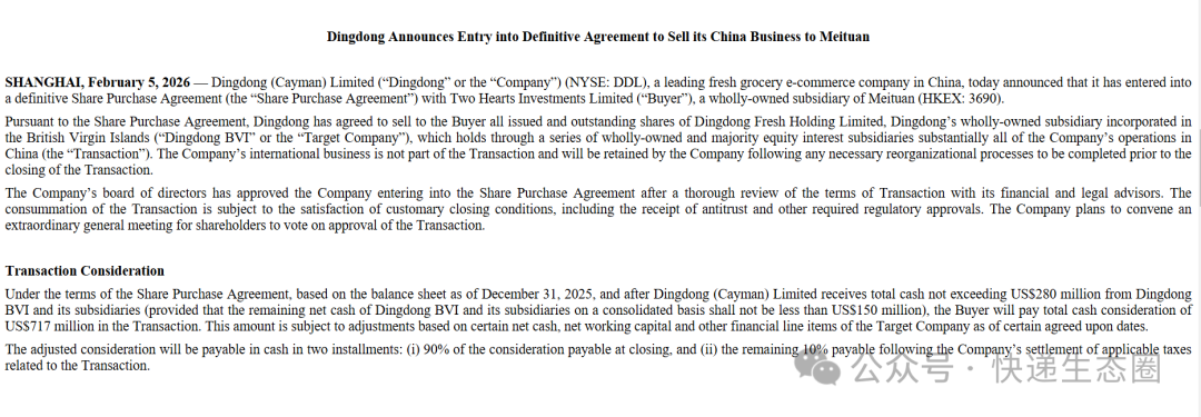 收购方Two Hearts Investments Limited(本公司的间接全资附属公司)、转让方Dingdong(Cayman)Limited及梁昌霖订立股份转让协议,转让方同意出售转让方所持有目标公司Dingdong Fresh Holding Limited全部已发行股份,初始代价为7.17亿美元(可予调整),惟转让方可从目标集团提取不超过2.8亿美元的资金后,仍需确保目标集团净现金不低于1.5亿美元。
